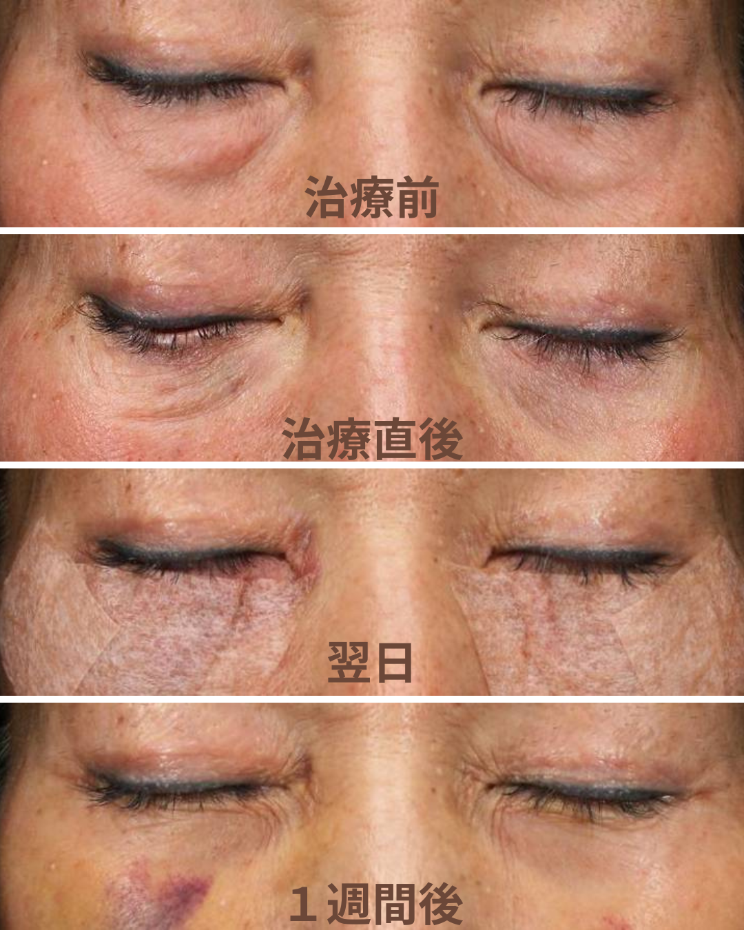 腫れ、熱感、内出血、むくみ、違和感が数日〜2週間ほど続くことがあります。稀に脂肪の取り過ぎによる目元の窪みやシワの増加、左右差が生じるリスクもあります。